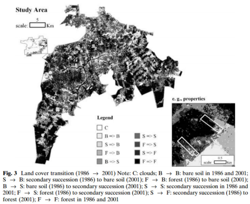 This paper considers the size of a farmer’s property as a key variable influencing land cover and land cover change in rural areas of developing countries. Data from 126 rural familial properties in the region around the city of Santarém, Pará, in the Brazilian Amazon, indicate that property size is important for understanding the trajectories of land cover change. Past research has focused on the distinction between small family farms and large capitalized farms, arguing that family farmers have a higher deforestation intensity, or on estimating the strength of the effect of property size relative to economic or demographic factors. This paper shows that larger familial properties are able both to retain a larger area in forest and to have long enough cycles of use and fallow to allow previously used land to become forested again. Based on these analyses and discussion, we argue that land use and land cover research must consider property size as an organizing principle in order to better comprehend the reciprocal relationship between population and environment in frontier areas of the Brazilian Amazon and other rural landscapes.
